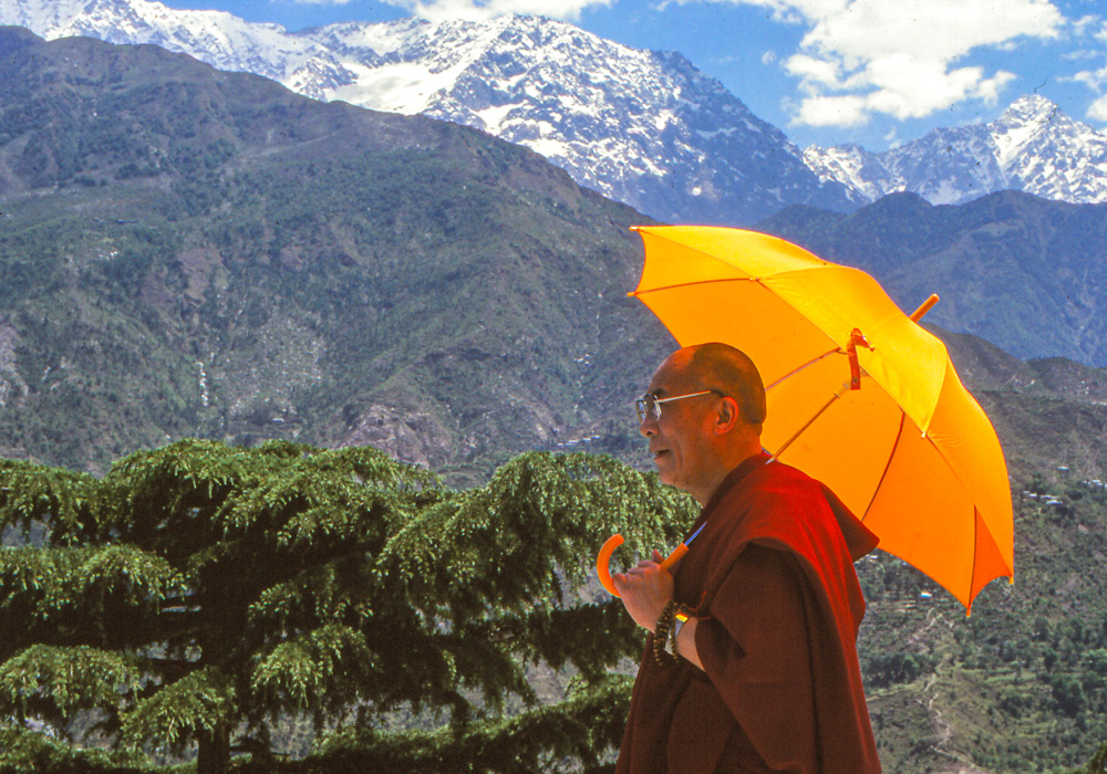 His Holiness the Dalai Lama and snow mountains, McLeod Ganj.